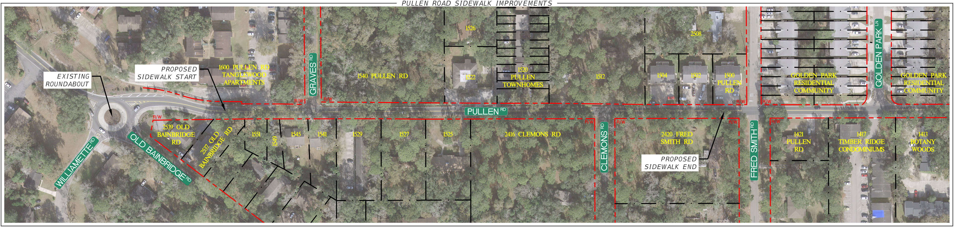 To enhance safety and mobility options in the area, the City of Tallahassee began construction of the Pullen Road Sidewalk Improvements Project. The purpose of the project is to construct a new sidewalk along the south side of Pullen Road from the existing sidewalk near Old Bainbridge Road to the existing sidewalk at Fred Smith Road.
